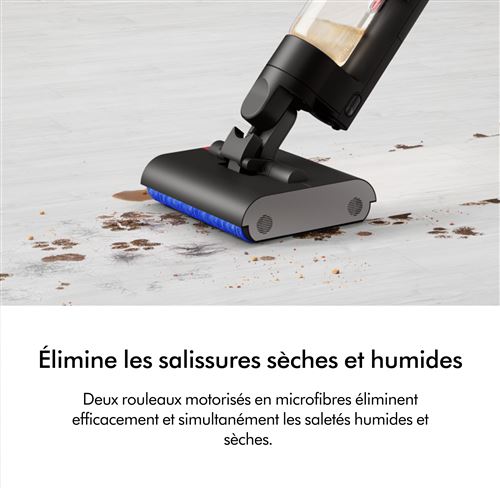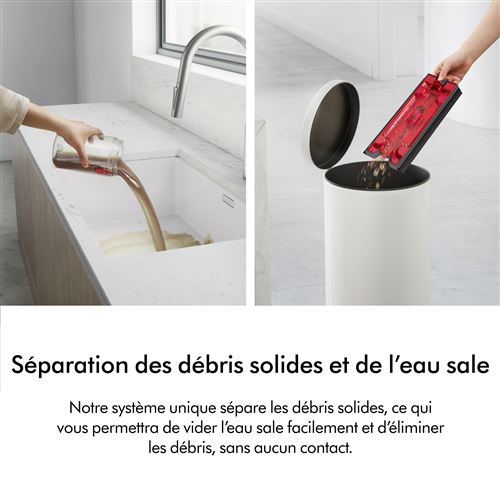 Su sistema de separación de sólidos y líquidos facilita una eliminación higiénica de los residuos, mientras que los rodillos secundarios girando en direcciones opuestas proporcionan una limpieza ligera, fluida y sin esfuerzo, incluso alrededor de muebles, sillas o patas de mesa.