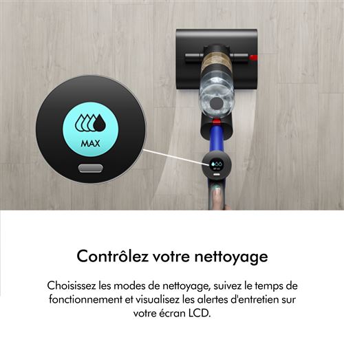 La pantalla integrada muestra el tiempo de ejecución, alertas, guías interactivas y estado de mantenimiento, con un código QR que permite configurar fácilmente la aspiradora mediante la aplicación MyDyson.